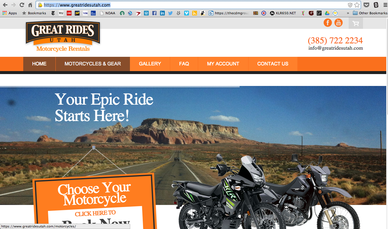 Great Rides Utah is a fledgling ADV-rental operation out of Salt Lake City (West Valley City, to be precise), run by a pair of enterprising young friends—Patrick and Raphael. It’s conceived to serve ADVenturenauts just like us. You can fly into SLC with your space suit, take a 12-minute taxi to their shop, load up your bike, and be riding out to the desert or mountains as soon as you can buckle your helmet. (Just take it out of the bag first, J).