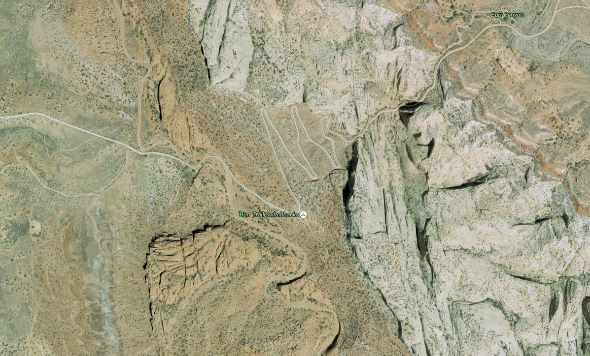 Burr Trail in the park concludes with a series of spectacular switchbacks that take you down several hundreds of feet, and through some incredible rock formations. Here’s the view from Google Earth…