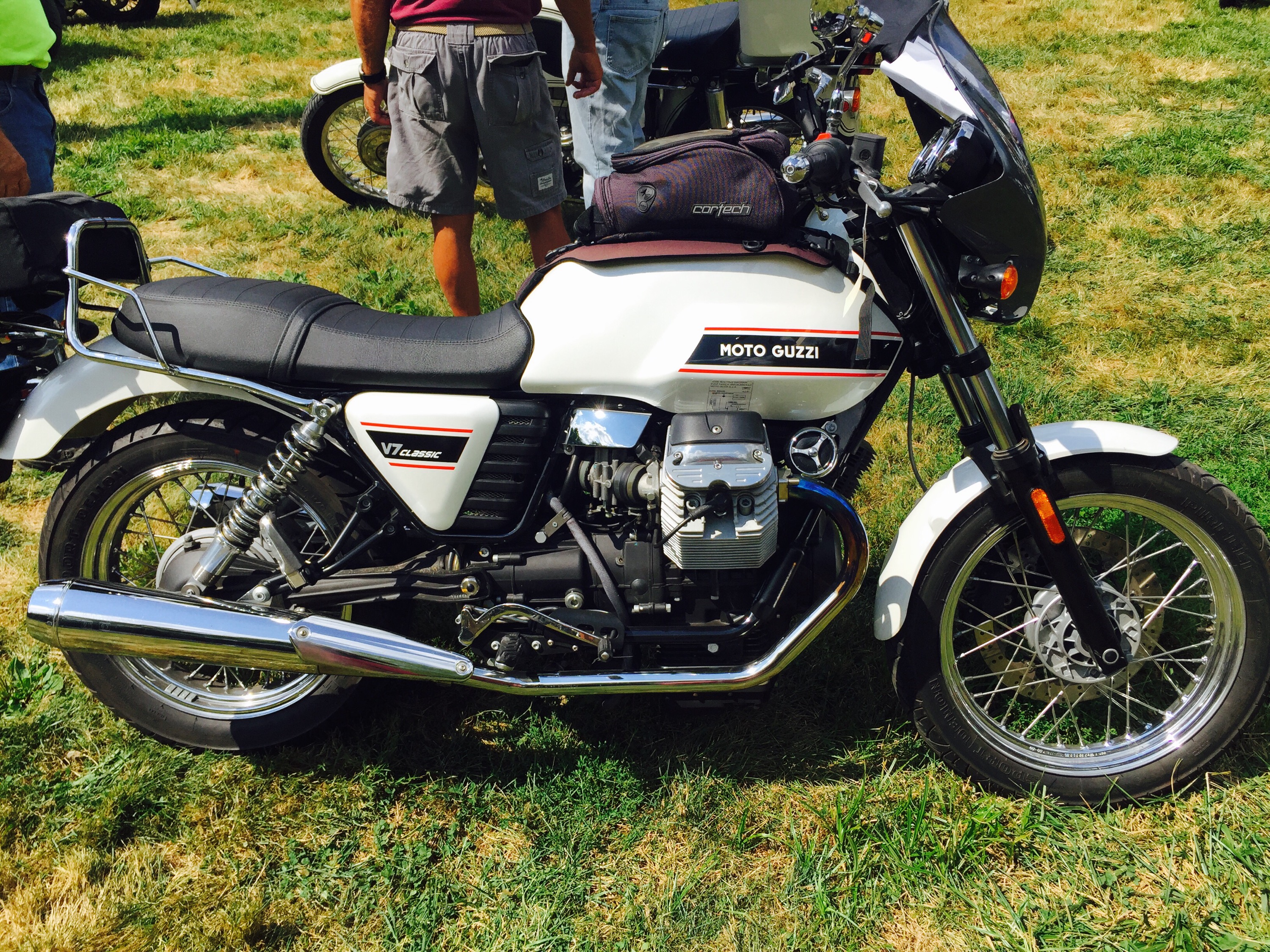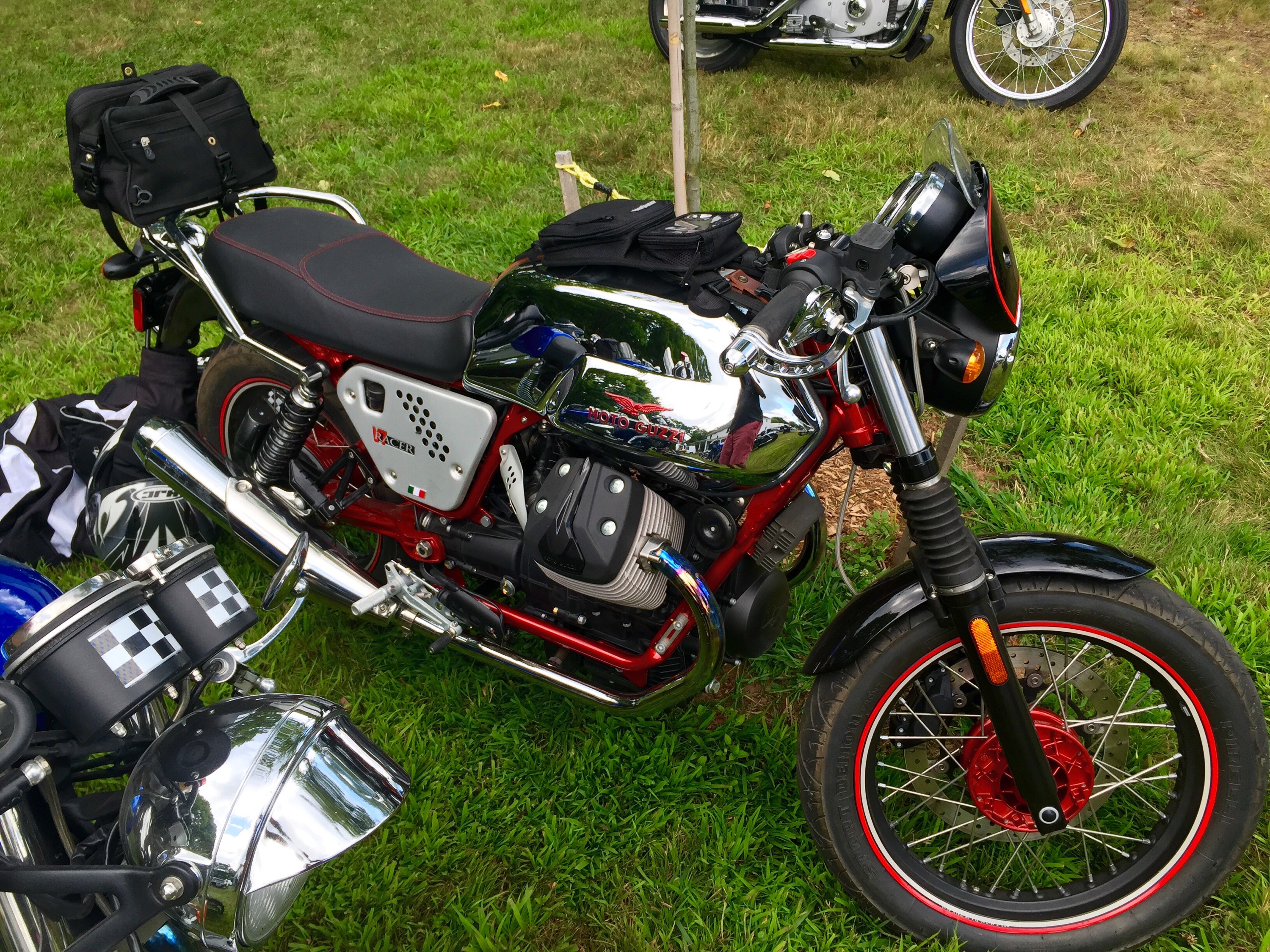 And then someone rode to Brit Jam on its flashier cousin, the V7 Racer, which with its crimson metal frame and seat stitching, honking chrome tank, and vented aluminum side panels (there’s also a number plate, but kinda hard to ride with that and not feel a little tool-ish) is either vulgar, or gorgeous, or both. I’ll call it…vulgeous. (Wait—that sounds kinda wrong…)