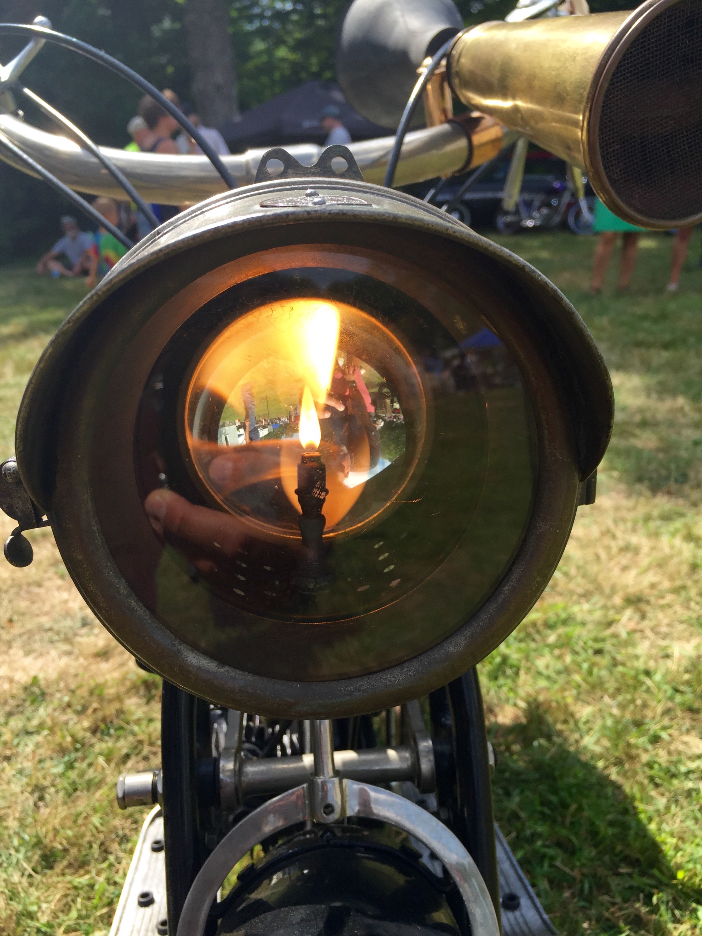 Besides the hand-sewn leather tank guards and picnic panniers and a wicker “top box,” the coolest feature was a primordial brass head lamp, essentially an enclosed acetylene lantern with a concave mirror to “throw” a beam generated by—quite literally—an open flame. This, accompanied by a hand-activated rubber-and-brass horn, which I guess was used to shoo errant sheep from the Bristol roadways…